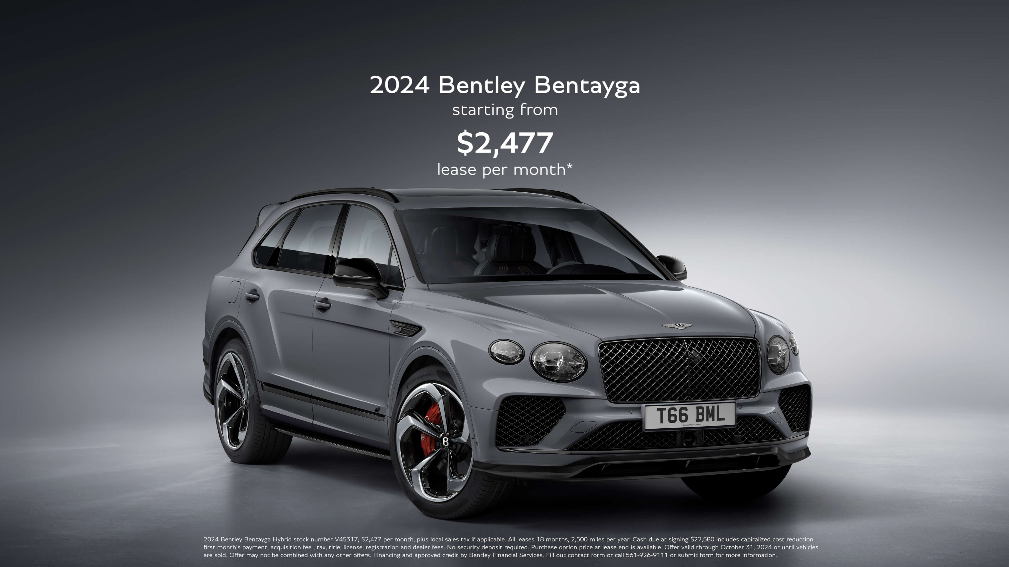 2024 Bentley Bentayga Hybrid stock number V45317; $2,477 per month, plus local sales tax if applicable. All leases 18 months, 2,500 miles per year. Cash due at signing $22,580 includes capitalized cost reduction, first month's payment, acquisition fee , tax, title, license, registration and dealer fees. No security deposit required. Purchase option price at lease end is available. Offer valid through October 31, 2024 or until vehicles are sold. Offer may not be combined with any other offers. Financing and approved credit by Bentley Financial Services. Fill out contact form or call 561-926-9111 or submit form for more information.