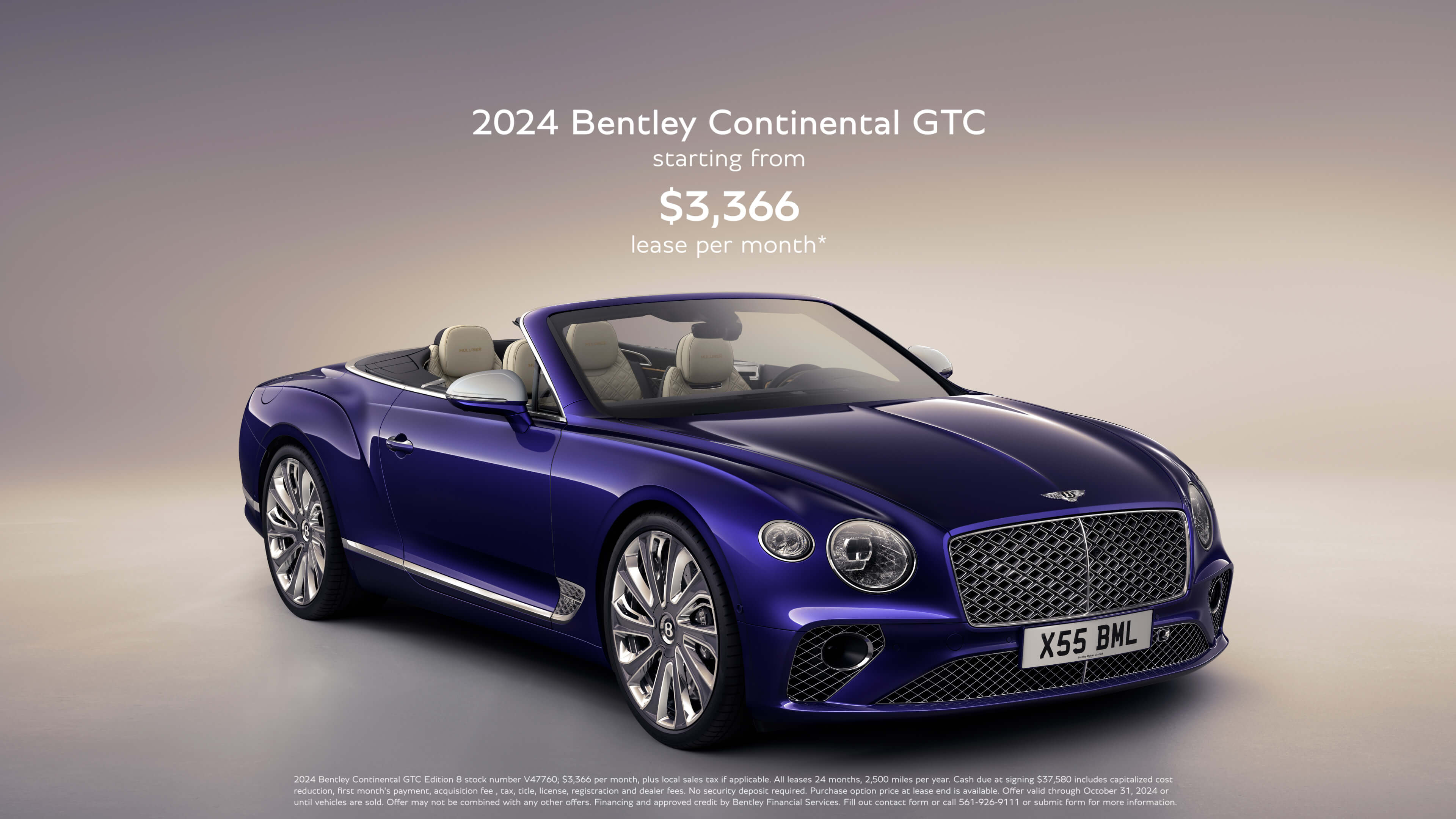 2024 Bentley Continental GTC Edition 8 stock number V47760; $3,366 per month, plus local sales tax if applicable. All leases 24 months, 2,500 miles per year. Cash due at signing $37,580 includes capitalized cost reduction, first month's payment, acquisition fee , tax, title, license, registration and dealer fees. No security deposit required. Purchase option price at lease end is available. Offer valid through October 31, 2024 or until vehicles are sold. Offer may not be combined with any other offers. Financing and approved credit by Bentley Financial Services. Fill out contact form or call 561-926-9111 or submit form for more information.