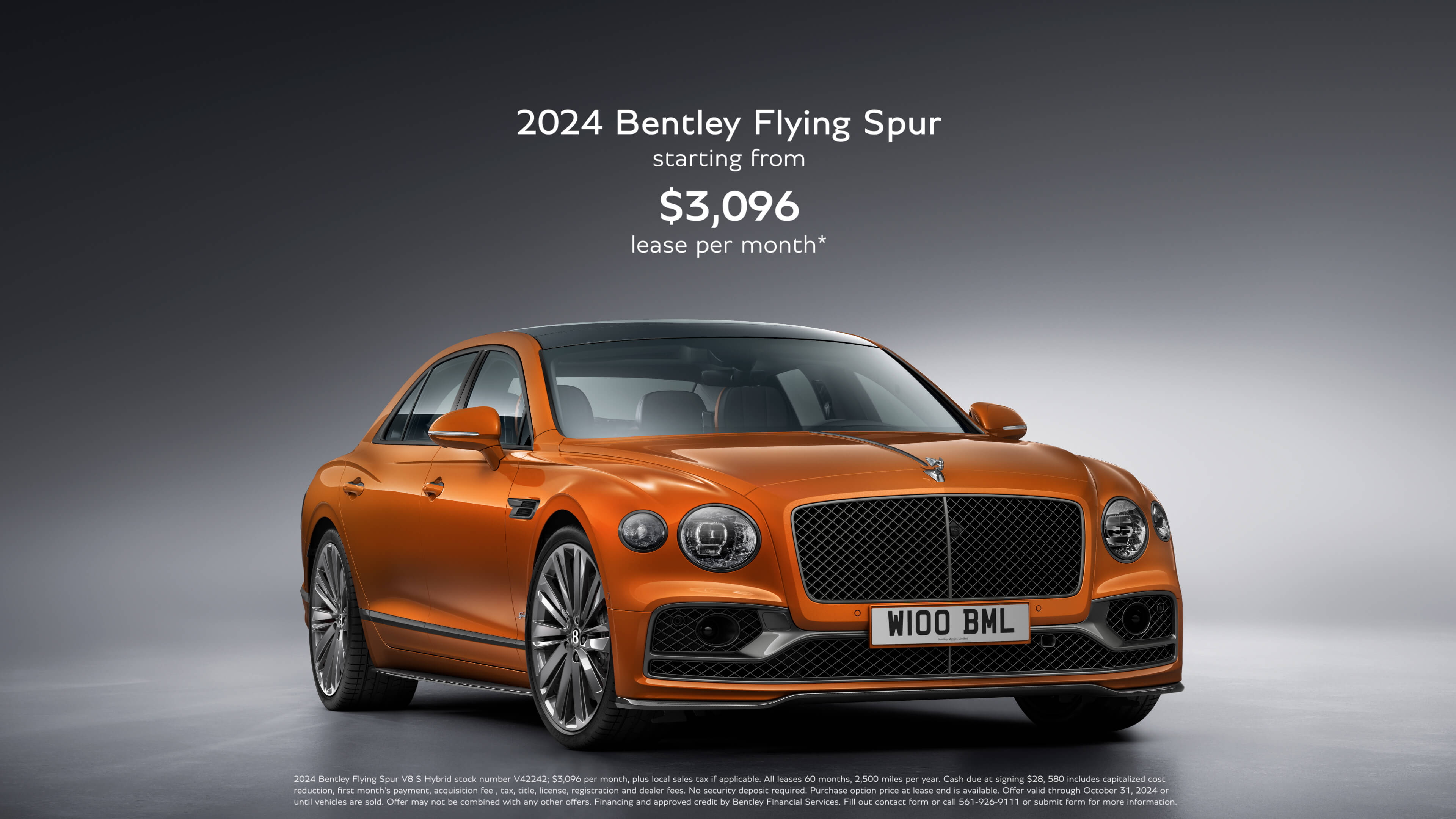 2024 Bentley Flying Spur V8 S Hybrid stock number V42242; $3,096 per month, plus local sales tax if applicable. All leases 60 months, 2,500 miles per year. Cash due at signing $28, 580 includes capitalized cost reduction, first month's payment, acquisition fee , tax, title, license, registration and dealer fees. No security deposit required. Purchase option price at lease end is available. Offer valid through October 31, 2024 or until vehicles are sold. Offer may not be combined with any other offers. Financing and approved credit by Bentley Financial Services. Fill out contact form or call 561-926-9111 or submit form for more information.